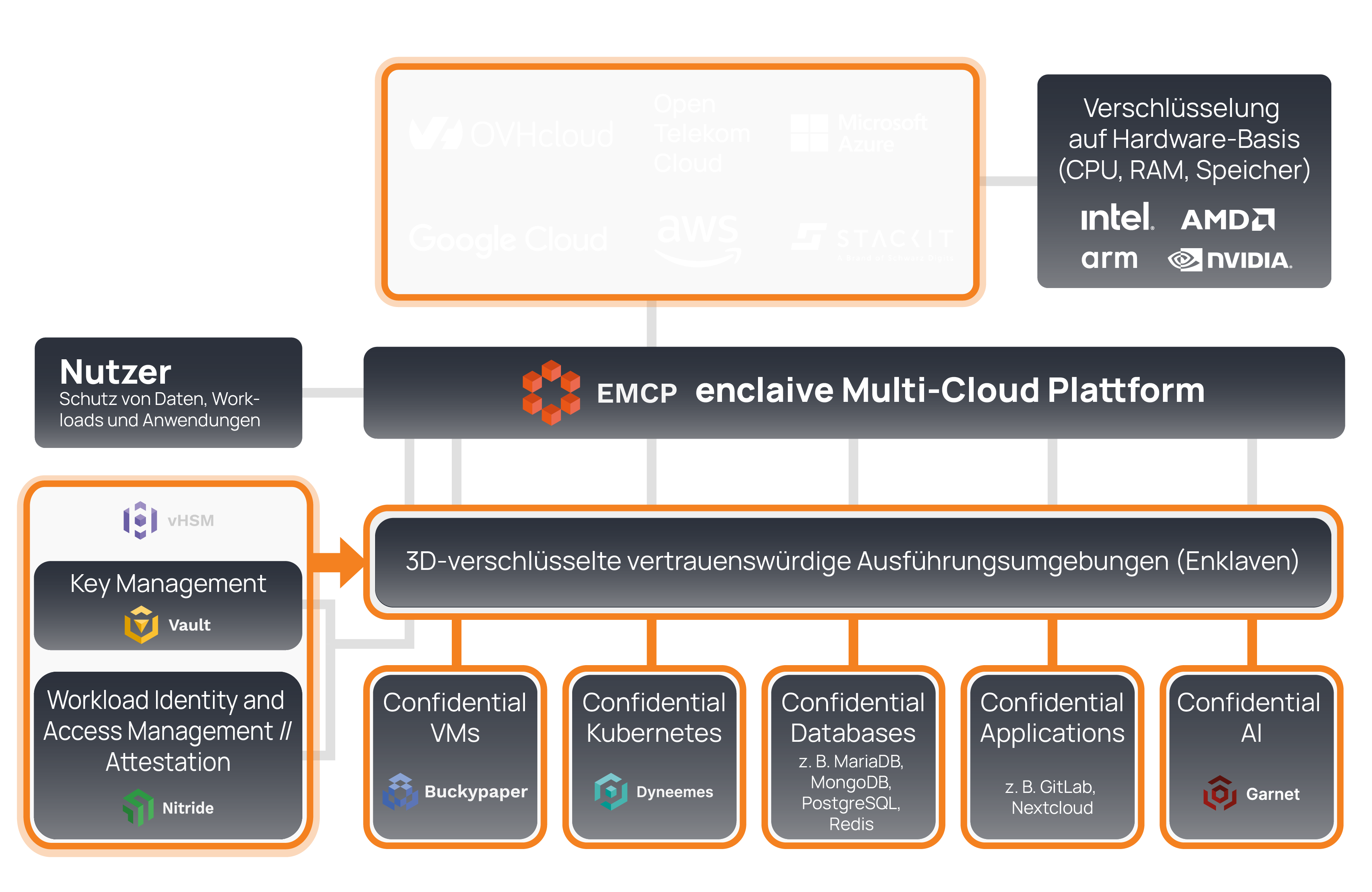 Eine solche Verschlüsselung in allen drei Dimensionen (At Rest, In Motion und In Use) galt lange als unmöglich – jetzt tritt enclaive den Gegenbeweis an: Aufsetzend auf robuste virtuelle Hardware-Security-Module bieten wir mit der enclaive Multi-Cloud Platform eine Lösung, die es Ihnen leicht macht, Daten auch in der Laufzeitumgebung und sogar in komplexen Multi-Cloud-Umgebungen jederzeit hochsicher zu verschlüsseln. Damit behalten Sie die volle Kontrolle über Ihre Daten.